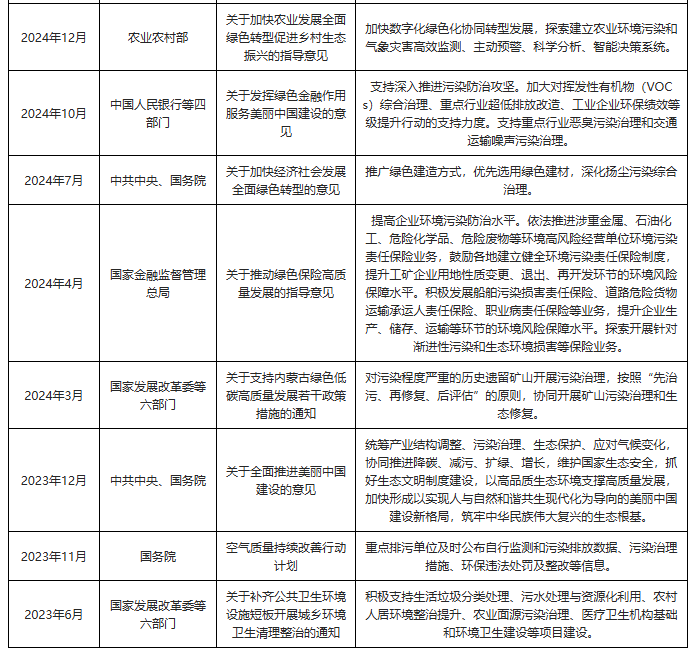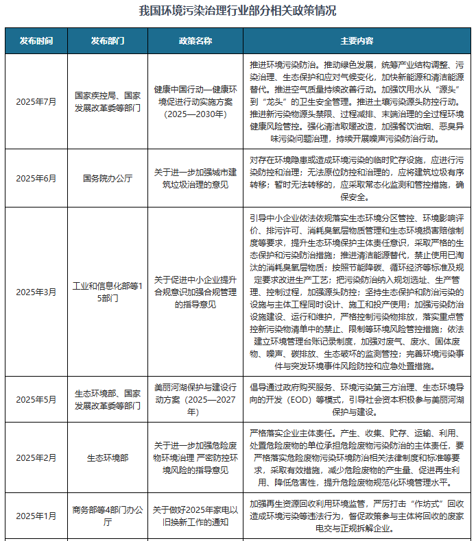 为了进一步推动环境污染治理行业的发展◁,我国陆续发布了多项政策,如2025年7月国家疾控局、国家发展改革委等部门发布《健康中国行动—健康环境促进行动实施方案(2025—2030年)》推进环境污染防治。推动绿色发展=☆,统筹产业结构调整、污染治理▽、生态保护和应对气候变化,加快新能源和清洁能源替代。推进空气质量持续改善行动。加强饮用水从“源头”到•☆•“龙头”的卫生安全管理。推进土壤污染源头防控行动◆○。推进新污染物源头禁限=▪▲、过程减排、末端治理的全过程环境健康风险管控。强化清洁取暖改造=…,加强餐饮油烟、恶臭异味污染问题治理▽,持续开展噪声污染防治行动。